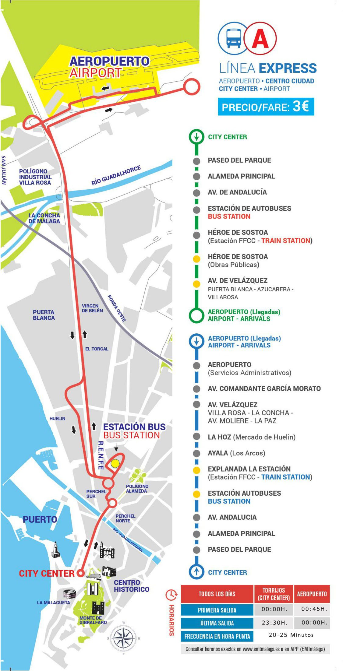 Un bus, Linea A Express, collega l’aeroporto con la città con una frequenza di 20-25 minuti (dalle 7:00 alle 24:00) e costa 3€, è possibile fare il biglietto sull’autobus. La fermata dell’aeroporto di Malaga si trova nel Terminal 3, piano 0 proprio di fronte agli arrivi. Inoltre, lungo il tragitto ci sono delle fermate intermedie come quella della Stazione dei Treni Maria Zambrano e quella della Stazione degli autobus.